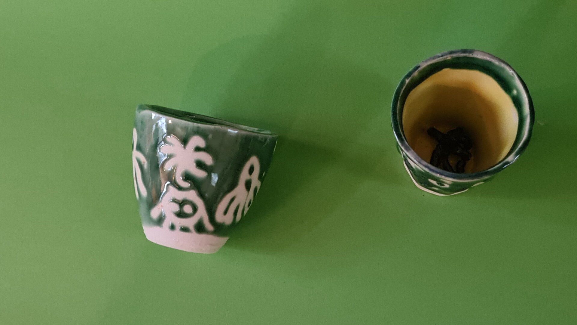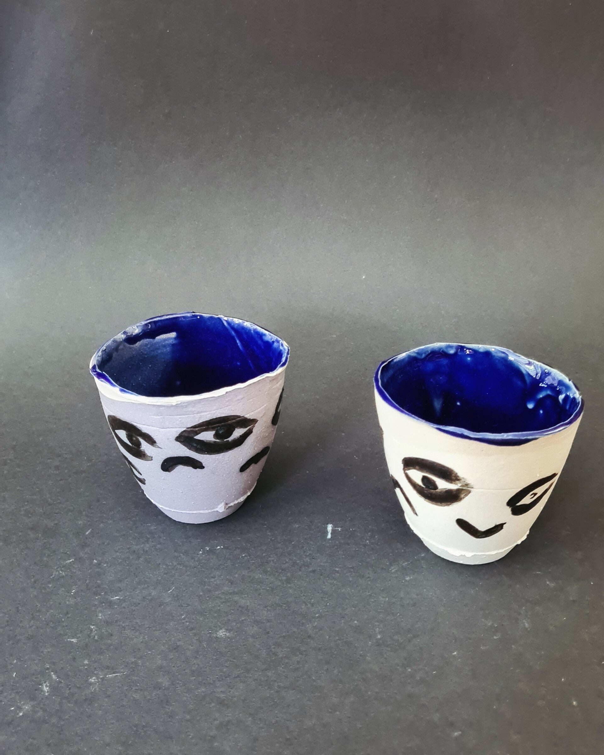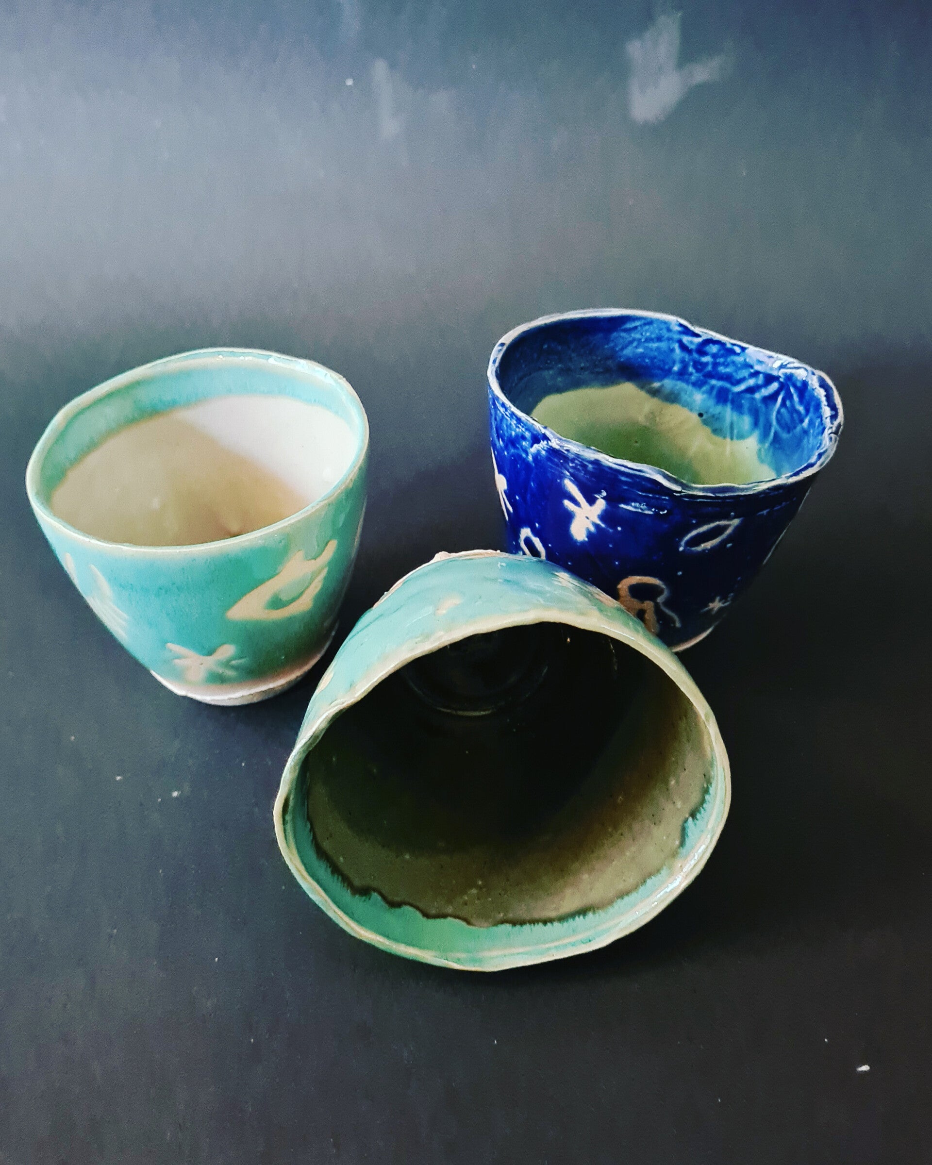 Ik houd erg van bekers met een verrassing erin, bijvoorbeeld een kleine spin. Ook bekers met een vogel als handvat zijn favoriet. Het is ook leuk om kleine stekjes in een geglazuurde beker te planten…