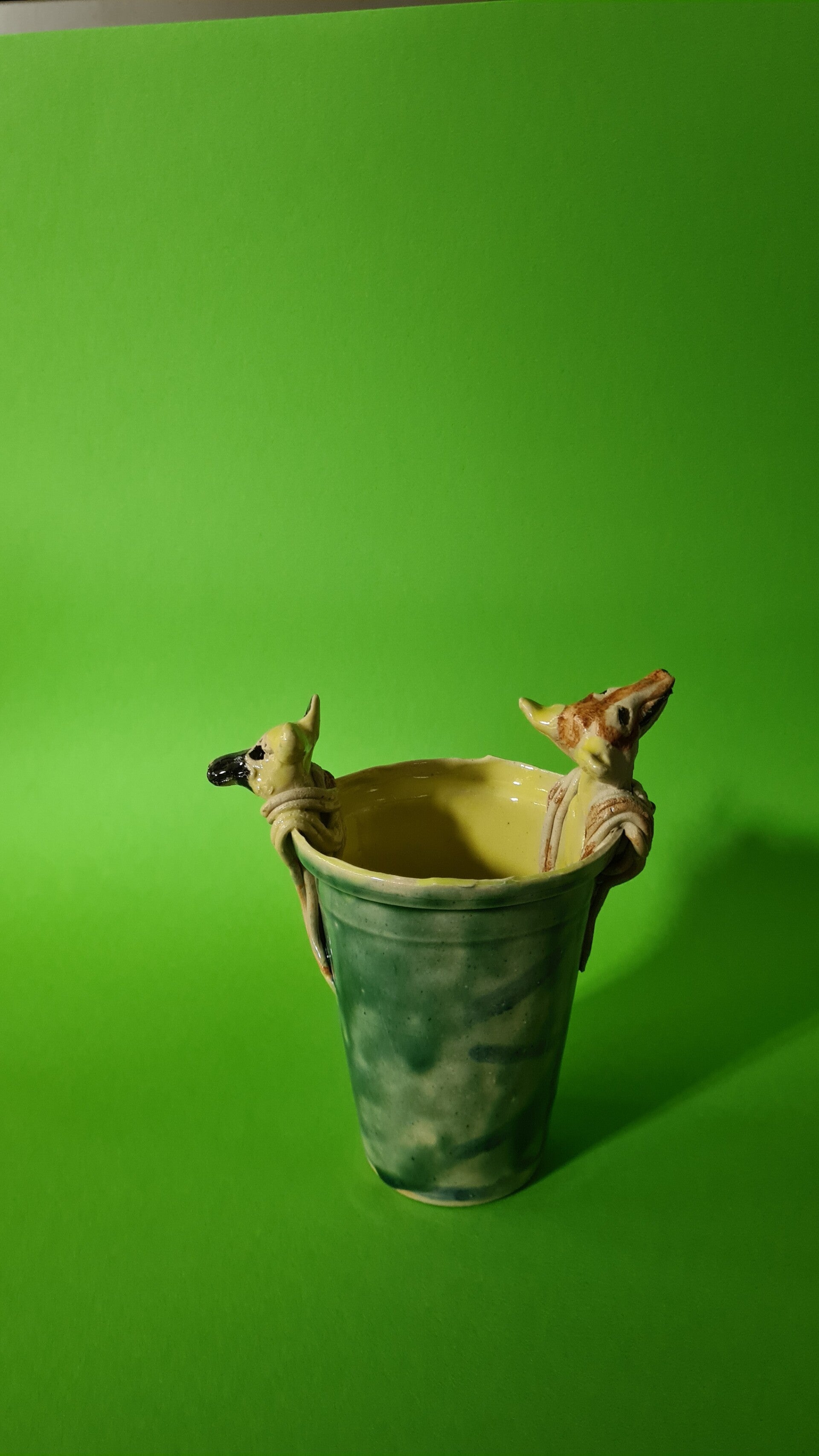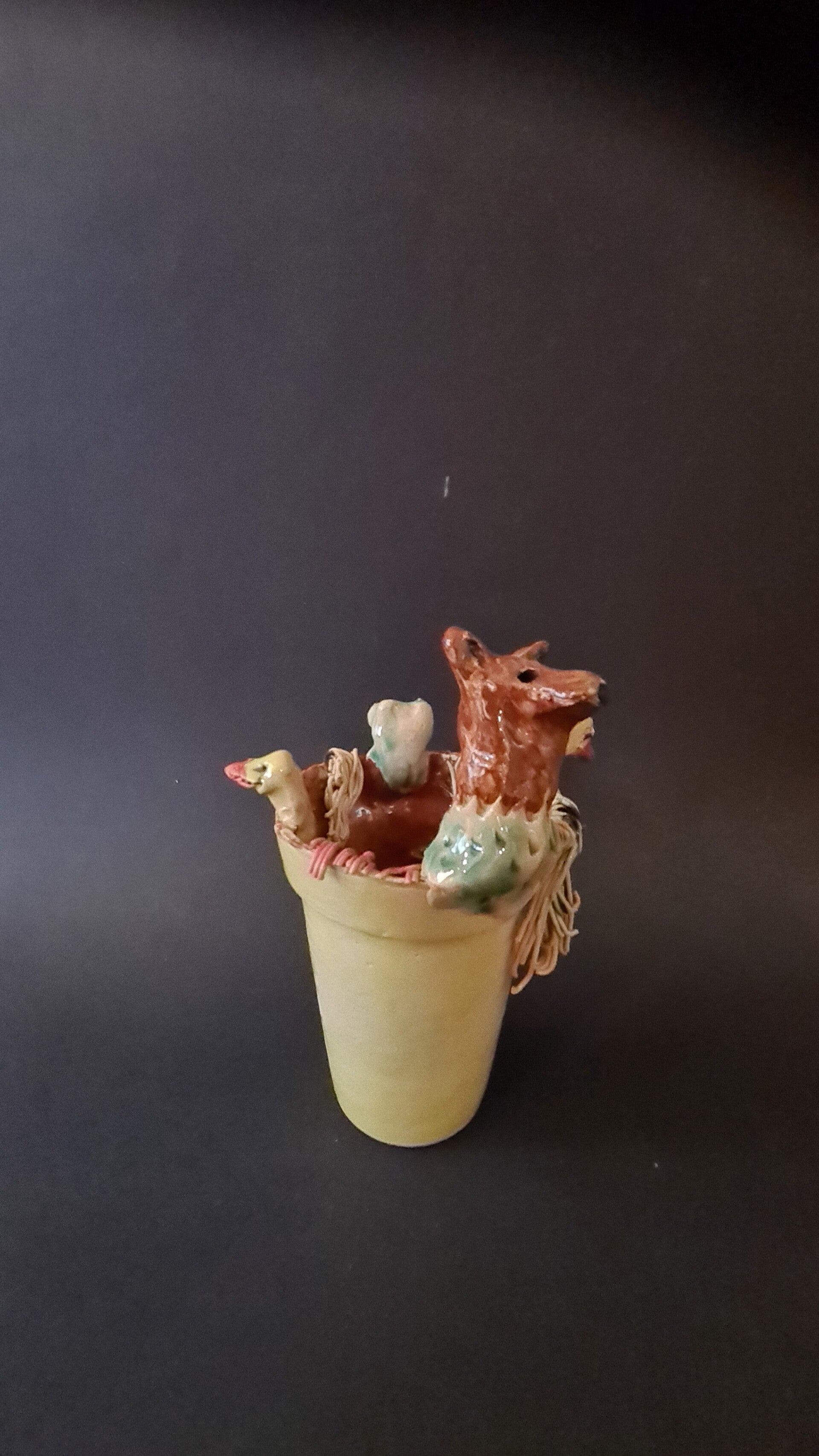 De vaasjes zijn uniek, niet alleen door hun functionaliteit, maar vooral door de speelse keramische figuren die hen sieren. Deze figuren, vaak rare beesten of andere onverwachte creaties, dagen je uit om anders te kijken naar de wereld en een beetje humor in je dagelijks leven te brengen. Elk vaasje is handgemaakt en draagt de signatuur van 'De Klei Mythe': unieke keramiek beelden met een knipoog.